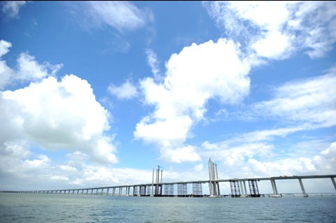 青岛海湾大桥,东起青岛主城区308国道杨家群入口处,跨越胶州湾海域,西至黄岛红石崖,(一期工程)路线全长新建里程28.047 公里, (二期工程12公里。)其中海上段长度 25.171 公里,青岛侧接线 749 米 、黄岛侧接线 827.021 米 、红岛连接线长 1.3 公里。主线桥宽35米,双向六车道,设计行车速度 80 公里 / 小时,工程概算投资 90.4 亿元。 预计将于2011 年建成。